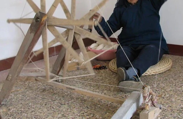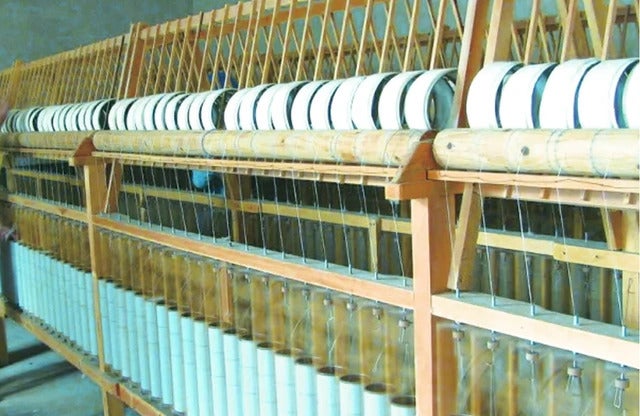 明治時代に発明され受け継がれる紡績機で、現代の大量生産の紡績の100倍以上の時間をかけゆっくりとアナログで糸が紡がれます。このゆっくり紡がれた糸には、吸水力・吸油力のカギとなる空気のたっぷりと包含した繊維が出来上がるのです。