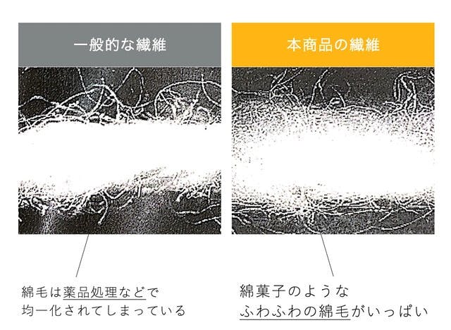 下記は、一般的な紡績方法で紡いだ繊維(左)と、本商品の繊維(右)を拡大比較しています。