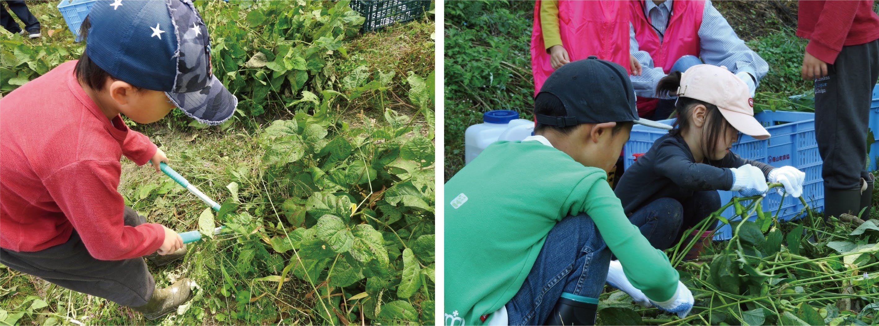 昨年には、丹波篠山名産の「黒枝豆」の収穫のお手伝い体験を行い、実際にお客様にお届けする「黒枝豆」の収穫を子供たちと行いました。