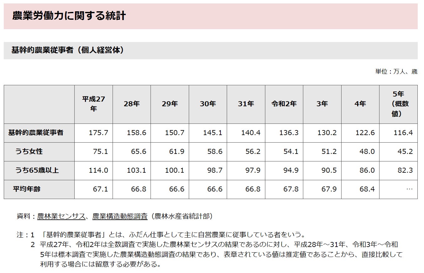 農林水産省が公表した「農業労働力に関する統計」によると、基幹的農業従事者(仕事として主に自営農業に従事している者)の数は、2017年(平成29年)が150.7万人だったのに対し、2022年(令和4年)は122.6万人まで減少し、5年で18%以上も減っています。