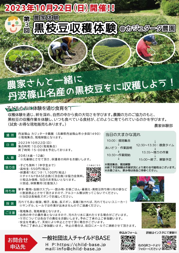 「カジュタータ農園」のご協力のもと、昨年大好評いただきました「黒枝豆の収穫体験」を、今年は10月22日に行います。