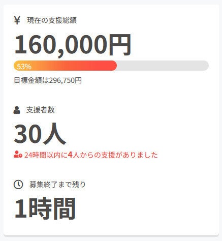 お世話になっております。 名無しの東北県人です。 前回の活動報告から現在までの間に、 新たに1名の方がご支援を行って下さいました。 現在の調達率は53%、パトロン様は30名となっております。 本当にありがとうございます。 引き続き、何卒宜しくお願い致します。