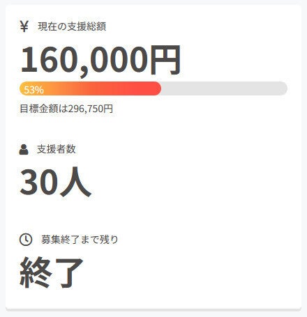 このプロジェクトは、2023/08/18に募集を開始し、 30人の支援により 160,000円の資金を集め、 2023/08/31に募集を終了しました