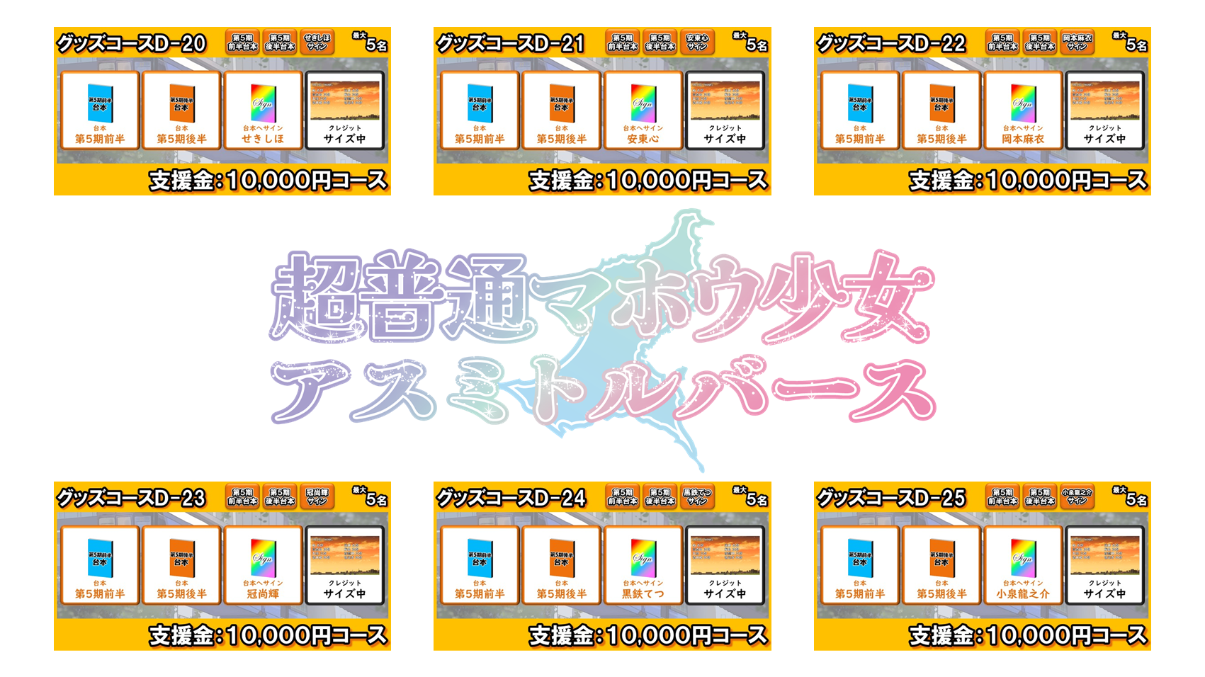 (誠に申し訳ありません。記事に誤りがありました。新規返礼品の追加日程は3/5水0時ではなく3/6水0時の予定です)みなさん、こんにちは。この度は、私たちが計画する「声優やキャラクターが参加できる千葉が舞台の地上波TVアニメ制作プロジェクト」ページを見てくださり、誠にありがとうございます。このプロジェクトは、私たちが制作している千葉を舞台にしたご当地作品の第5期「超普通マホウ少女 アスミトルバース」の制作およびTVアニメ放送を目的としたものです。3/6水0時(予定)に返礼品追加第6弾を行います。今回の追加返礼品は13本です。【内容1】第5期「超普通マホウ少女 アスミトルバース」のTVアニメ台本(前半)をお届けします/第1話~第6話掲載/注釈G参照【内容2】第5期「超普通マホウ少女 アスミトルバース」のTVアニメ台本(後半)をお届けします/第7話~第13話掲載/注釈G参照【内容3】内容1または内容2のどちらか希望する台本に魔物役のせきしほさん直筆サインがつきます/希望する台本を選択ください/注釈J参照【内容4】好きなお名前をクレジット掲載します/掲載作品:制作内容A「第5期 超普通マホウ少女 アスミトルバース」EDおよびHP/クレジットサイズ:中/備考欄に希望するお名前を記載ください/注釈A参照【内容1】第5期「超普通マホウ少女 アスミトルバース」のTVアニメ台本(前半)をお届けします/第1話~第6話掲載/注釈G参照【内容2】第5期「超普通マホウ少女 アスミトルバース」のTVアニメ台本(後半)をお届けします/第7話~第13話掲載/注釈G参照【内容3】内容1または内容2のどちらか希望する台本に魔物役の安東心さん直筆サインがつきます/希望する台本を選択ください/注釈J参照【内容4】好きなお名前をクレジット掲載します/掲載作品:制作内容A「第5期 超普通マホウ少女 アスミトルバース」EDおよびHP/クレジットサイズ:中/備考欄に希望するお名前を記載ください/注釈A参照【内容1】第5期「超普通マホウ少女 アスミトルバース」のTVアニメ台本(前半)をお届けします/第1話~第6話掲載/注釈G参照【内容2】第5期「超普通マホウ少女 アスミトルバース」のTVアニメ台本(後半)をお届けします/第7話~第13話掲載/注釈G参照【内容3】内容1または内容2のどちらか希望する台本に魔物役の岡本麻衣さん直筆サインがつきます/希望する台本を選択ください/注釈J参照【内容4】好きなお名前をクレジット掲載します/掲載作品:制作内容A「第5期 超普通マホウ少女 アスミトルバース」EDおよびHP/クレジットサイズ:中/備考欄に希望するお名前を記載ください/注釈A参照【内容1】第5期「超普通マホウ少女 アスミトルバース」のTVアニメ台本(前半)をお届けします/第1話~第6話掲載/注釈G参照【内容2】第5期「超普通マホウ少女 アスミトルバース」のTVアニメ台本(後半)をお届けします/第7話~第13話掲載/注釈G参照【内容3】内容1または内容2のどちらか希望する台本に魔物役の冠尚輝さん直筆サインがつきます/希望する台本を選択ください/注釈J参照【内容4】好きなお名前をクレジット掲載します/掲載作品:制作内容A「第5期 超普通マホウ少女 アスミトルバース」EDおよびHP/クレジットサイズ:中/備考欄に希望するお名前を記載ください/注釈A参照【内容1】第5期「超普通マホウ少女 アスミトルバース」のTVアニメ台本(前半)をお届けします/第1話~第6話掲載/注釈G参照【内容2】第5期「超普通マホウ少女 アスミトルバース」のTVアニメ台本(後半)をお届けします/第7話~第13話掲載/注釈G参照【内容3】内容1または内容2のどちらか希望する台本に魔物役の黒鉄てつさん直筆サインがつきます/希望する台本を選択ください/注釈J参照【内容4】好きなお名前をクレジット掲載します/掲載作品:制作内容A「第5期 超普通マホウ少女 アスミトルバース」EDおよびHP/クレジットサイズ:中/備考欄に希望するお名前を記載ください/注釈A参照【内容1】第5期「超普通マホウ少女 アスミトルバース」のTVアニメ台本(前半)をお届けします/第1話~第6話掲載/注釈G参照【内容2】第5期「超普通マホウ少女 アスミトルバース」のTVアニメ台本(後半)をお届けします/第7話~第13話掲載/注釈G参照【内容3】内容1または内容2のどちらか希望する台本に魔物役の小泉龍之介さん直筆サインがつきます/希望する台本を選択ください/注釈J参照【内容4】好きなお名前をクレジット掲載します/掲載作品:制作内容A「第5期 超普通マホウ少女 アスミトルバース」EDおよびHP/クレジットサイズ:中/備考欄に希望するお名前を記載ください/注釈A参照【内容1】第5期「超普通マホウ少女 アスミトルバース」のTVアニメ台本(前半)をお届けします/第1話~第6話掲載/注釈G参照【内容2】第5期「超普通マホウ少女 アスミトルバース」のTVアニメ台本(後半)をお届けします/第7話~第13話掲載/注釈G参照【内容3】内容1または内容2のどちらか希望する台本に月下モノカ役の夏川椎菜さん直筆サインがつきます/希望する台本を選択ください/注釈J参照【内容4】好きなお名前をクレジット掲載します/掲載作品:制作内容A「第5期 超普通