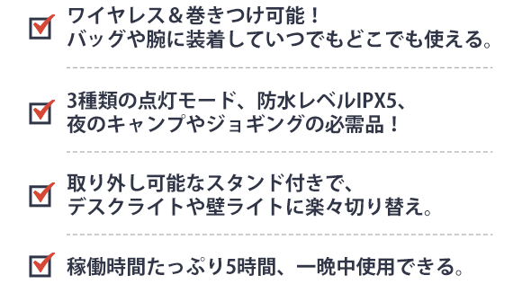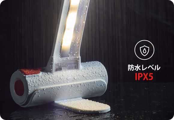 防水レベルIPX5ですので、キャンプやジョギング中に突然雨に降られても安心です。