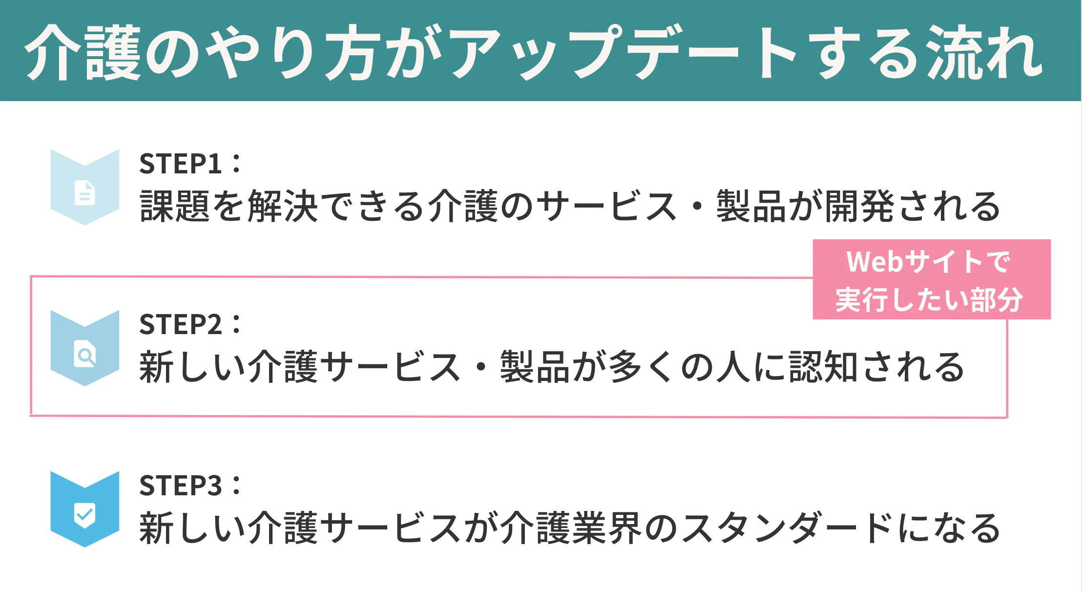 そのため、私が運営するWebサイトでは、②である介護サービスの認知獲得に貢献したいと考えております。