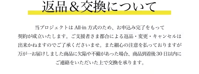 支援購入の性質上、配送遅延のおそれがございます。 原則として、配送遅延に伴う支援購入のキャンセルはできませんが、リターン配送予定月から3ヵ月を超えた場合には、希望者に限りキャンセルにて対応させていただきます。
