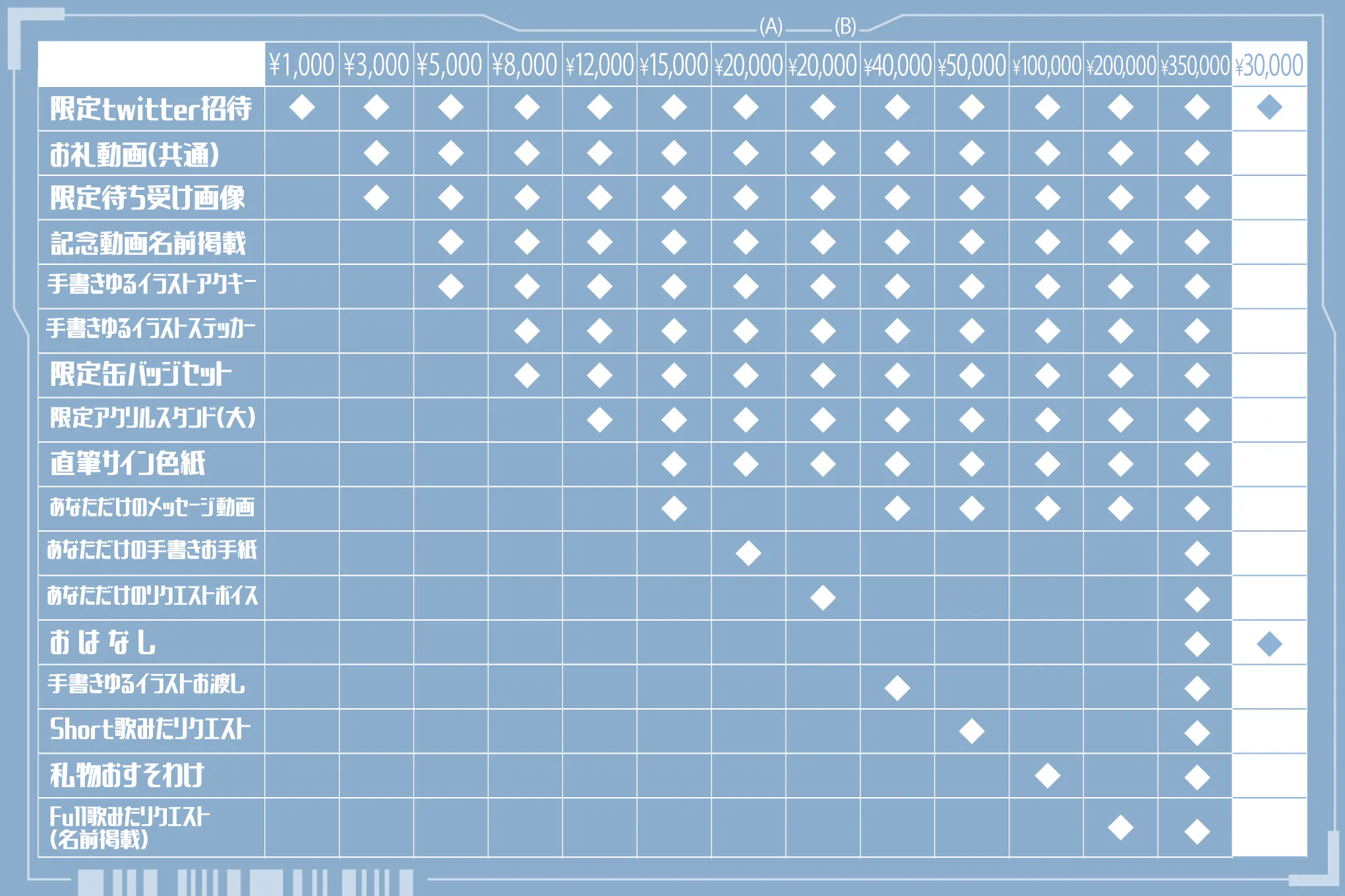 ・限定twitter(X)アカウント招待 / Live2Dお礼動画 / 限定待受 / 記念動画名前掲載 / 手書きゆるイラストアクキー / 限定缶バッジセット / 手書きゆるイラストステッカー / 限定アクリルスタンド(大) / 直筆サイン色紙 / あなただけのメッセージ動画 / あなただけの手書きお手紙 / あなただけのリクエストボイス / おはなし / 手書きゆるイラストお渡し / Short歌ってみたリクエスト / 私物おすそわけ / Full歌ってみたリクエスト