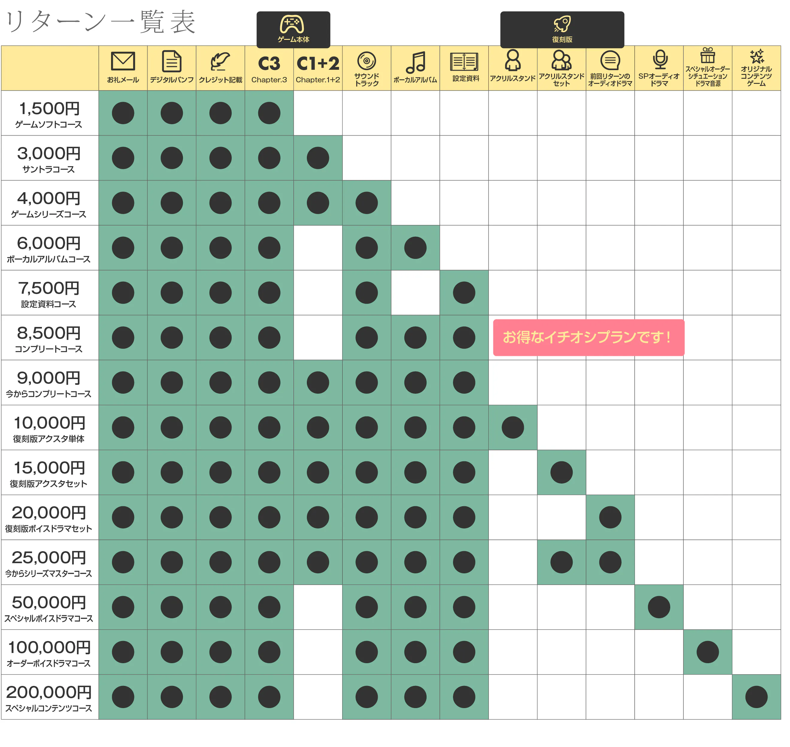 スペシャルドラマコースにChapter.1〜3のゲームだけではなく、過去のリターンであるボイスドラマ・アクスタセットもついてきて全てを網羅できます!