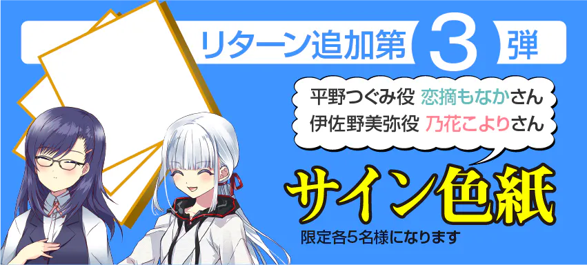 平野亜希役の「恋摘もなかさん」、伊佐野美弥役の「乃花こよりさん」のサイン色紙をリターンに追加しました!