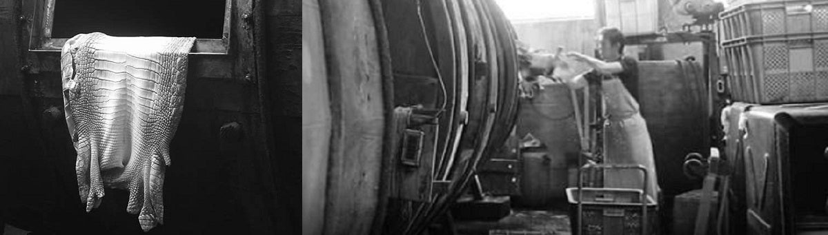 クロコダイルの鱗の特徴としては、丸い鱗の玉斑(たまふ)と長方形の竹斑(たけふ)がございます。藍染めも革の個体差による同じ色味に染まることは有りません。そして、一匹のクロコダイルから1本1本手縫いにて縫製していきます。よって、2つとして同じ柄、同じ色味はございません。『自然の風合い』をお楽しみください。
