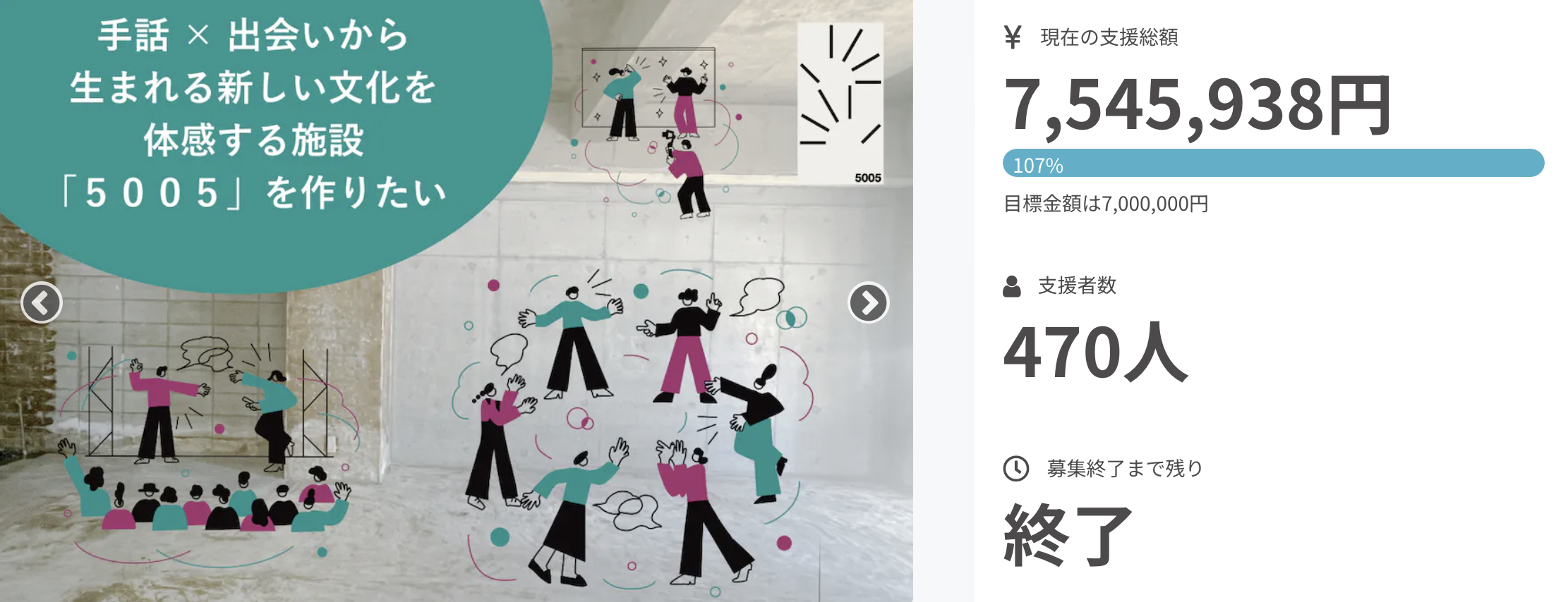 「手話×出会いから生まれる新しい文化を体感する施設「5005」を作りたい」10月18日23時59分、無事に終了しました。最終的に470名の方から、目標額の107%を超える754万5,938円が集まりました!2ヶ月間におよぶ募集期間の間、不安を感じる局面もありましたが、毎日のように増え続ける支援者の方々や応援してくださる様々なみなさまのおかげで、5005が掲げる理念を信じて進んで来ることができました。皆さんのご応援なしにこのプロジェクトの達成は成し得ませんでした。改めて心より深く御礼を申し上げます。クラウドファンディングは終了しましたが、これから5005の歩みが始まります。ただいまスタッフ一同、11月の本オープンに向けて鋭意準備中です。5005の内覧も受付が始まっておりますので、5005のご活用にご関心のある方はぜひ公式サイトをご覧いただけると嬉しいです。▶︎5005公式サイトまた5005のイベント情報が欲しい方は、下記のフォームよりご登録いただけますと、メールにて最新情報が受け取れます。よろしかったらぜひご登録ください。▶︎5005メルマガ5005を拠点に、視覚で世界を捉えるひとびとの創発が巻き起こっていくかと思うとこれからがとても楽しみです。ご応援してくださった皆さんと5005が、これからもつながり続けますように。そして、これから1つ1つ心を込めて、リターン(お礼品)の発送をします。気長にお待ち頂けると幸いです。まずは取り急ぎのお礼とご報告までとなり恐れ入りますが、重ねてお礼申し上げます。本当にありがとうございました!今後とも何卒よろしくお願いいたします。5005運営事務局