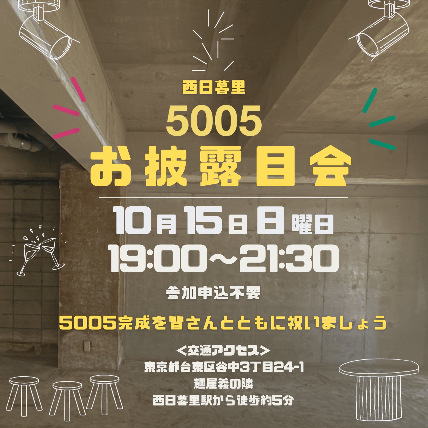 会場:5005 (東京都台東区谷中3-24-1野口ビル1-A 西日暮里駅から徒歩5分(麺屋「義」の隣です)
