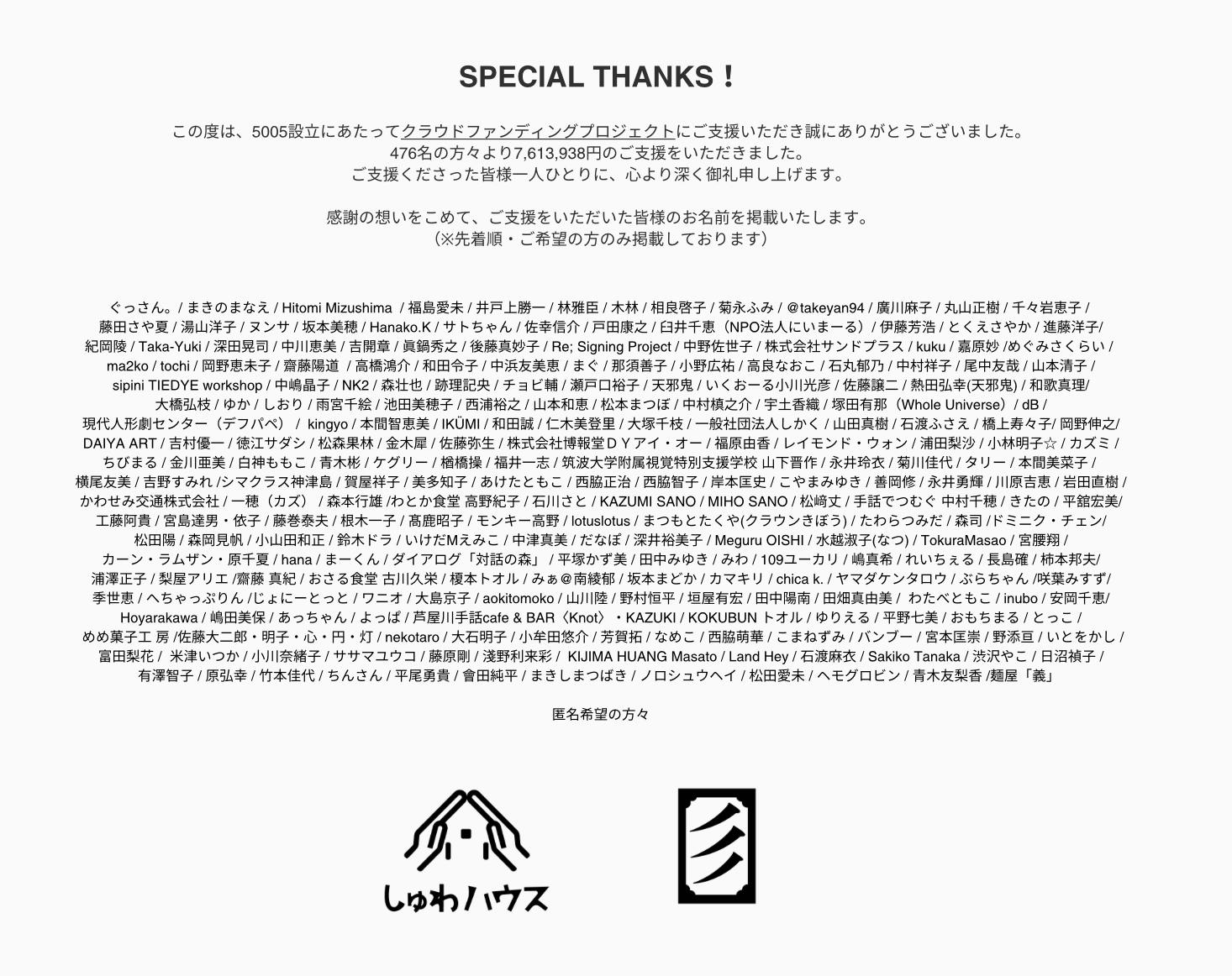 この度は、5005設立にあたってクラウドファンディングプロジェクトにご支援いただき誠にありがとうございました。