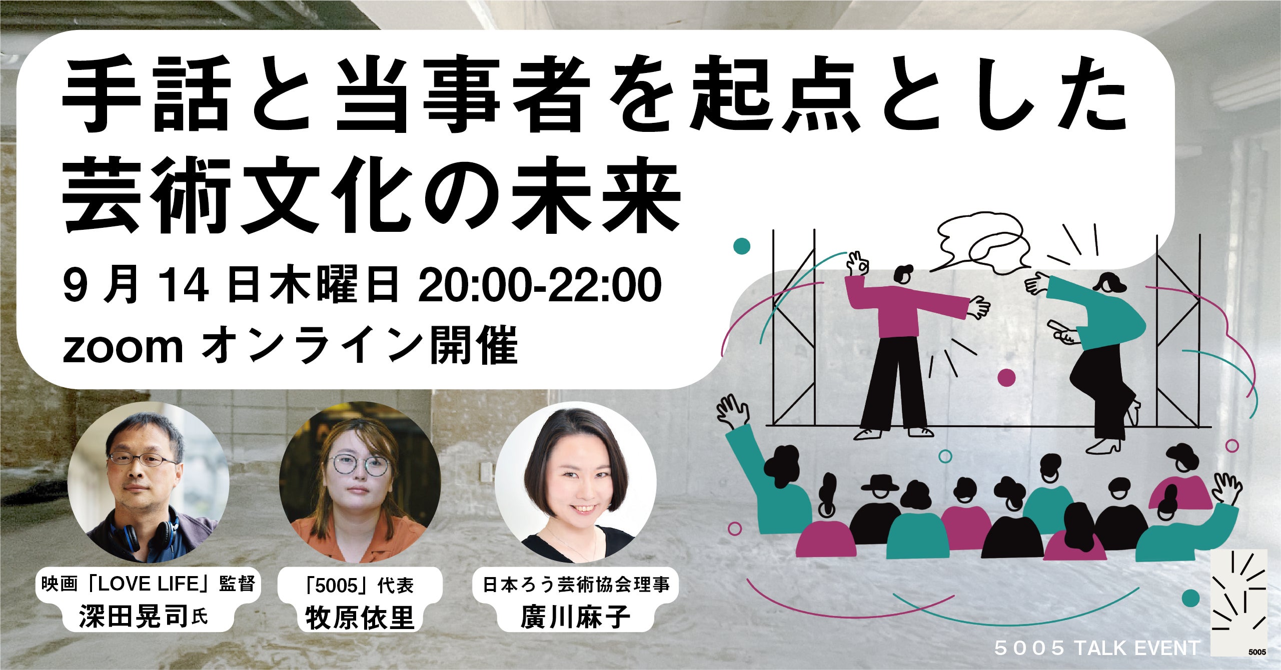 9月14日夜、オンラインにて深田晃司監督をゲストとしてお迎えし、5005代表の牧原依里、廣川麻子とともに、5005が目指す未来、その発展のためにどういった環境構築が必要なのか、当事者の権利が守られる対等な世界に向けて、社会に共有していく方法についてともに意見交換を行いました。 映画業界全体の多様な芸術文化を守っていくために日本にも日本版CNCという共助システムを取り入れるべく深田監督らが活動中ですが、実現することでろう者難聴者たちも参入することがより容易になる可能性が高まるという希望あふれる話から、100年前は白人も顔を黒塗りして黒人を演じていたのが今では考えられなくなっている話など、話題は多岐にわたりました。 当事者性を含む多様性や対等性を守り、多文化共生を目指していくには、経済力が必要になり、そのためのシステムを構築していかなければいけません。そのためにどうするべきなのか。共助システムを含め、課題とともに色々な可能性がみえた時間でした。 9月23日の「手話言語の国際デー」を前に、よりよい未来をつくっていくために私たちにできることは何か、やらなければいけないことは何か、一緒に考えていきたいと思います。ご参加いただいた視聴者の皆さん、ありがとうございました!---------------------------------------------------------------------おかげさまでクラウドファンディング、目標金額の50パーセントを突破しました!あと1ヶ月、引き続きご応援どうぞよろしくお願いいたします。
