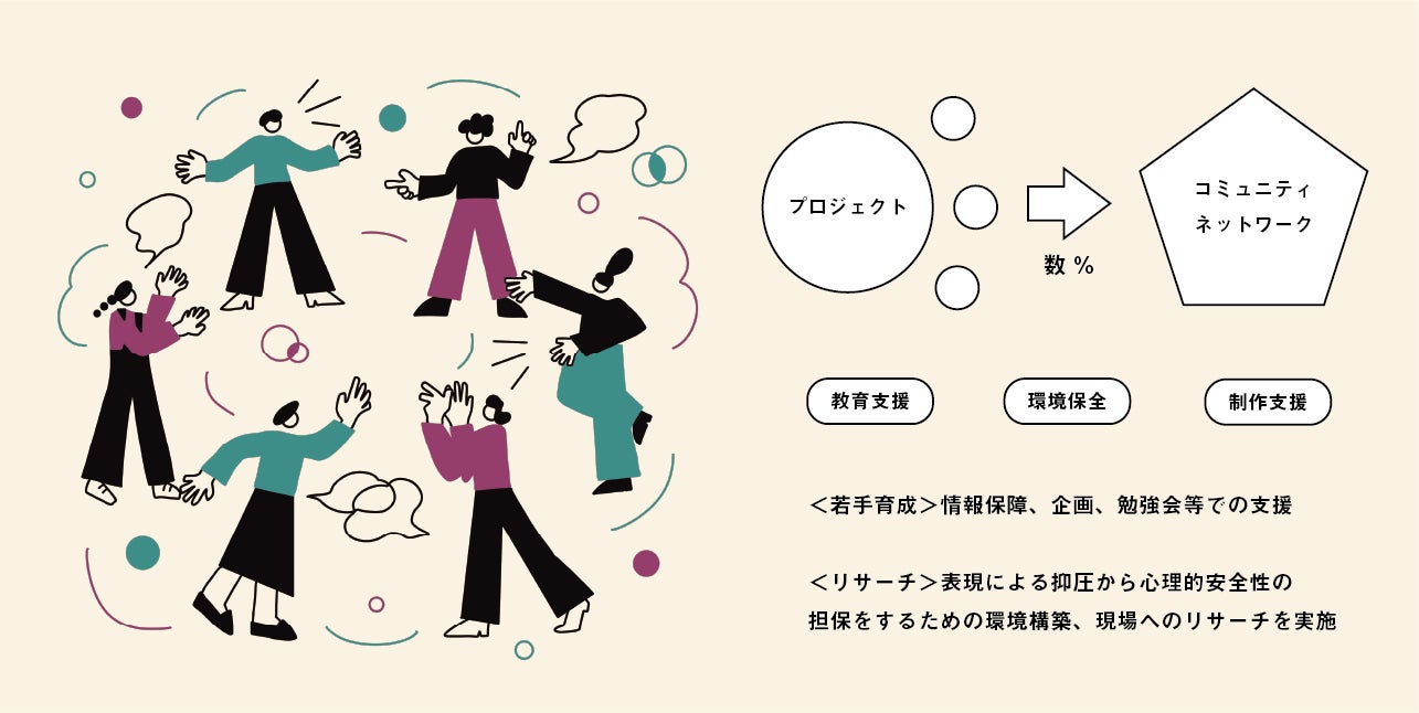レンタルスペースの利用料やイベント参加費、ラウンジ使用料などの売り上げの一部を、助成金として社会に還元する「共助」の仕組みを作ることで、視覚で生きる人々が、自分たちの文化を創発する環境を整え、持続可能性のある社会を目指しています。