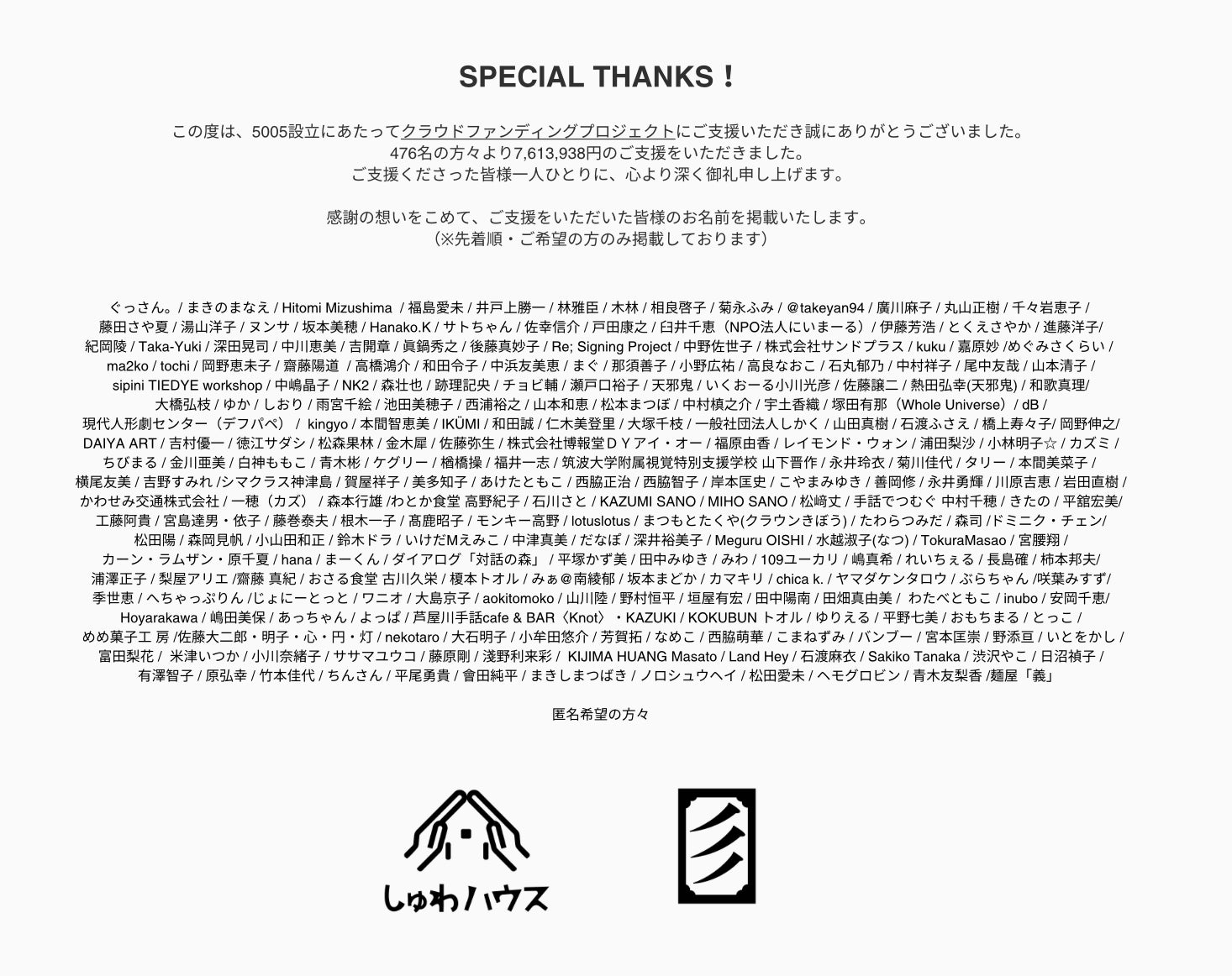 2023/10/23 21:16この度は、5005設立にあたってクラウドファンディングプロジェクトにご支援いただき誠にありがとうございました。5005へのダイレクト振込の方も合わせて、476名の方々より7,613,938円のご支援をいただきました。ご支援くださった皆様一人ひとりに、心より深く御礼申し上げます。感謝の想いをこめて、ご支援をいただいた皆様のお名前を公式サイトに掲載しました。https://5005place.com/※公式サイトの最下部に掲載しております。※先着順・ご希望の方のみ掲載しております。※1万円以上ご支援いただいた方々のリターンです。※掲載希望にもかかわらずお名前が掲載されていない場合や、お名前に不備がございましたら、誠に申し訳ございませんが、5005運営事務局<5005.place@gmail.com>までご連絡ください。後からお名前を記載したい場合もご対応可能です。重ね重ねになりますが、クラウドファンディングにお力添えいただいた全ての皆様に心より感謝申し上げます。この度は本当にありがとうございました。 もっと見る