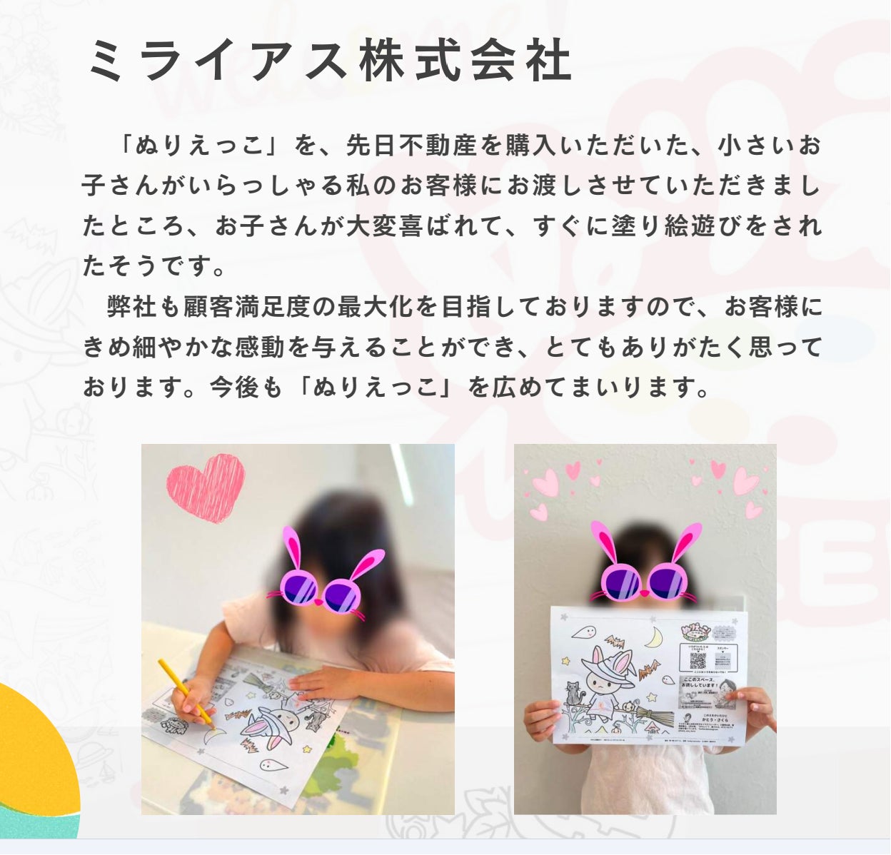 ・店舗でぬりえをしている事や、塗ってくれたぬりえを店舗に貼ることによって、第三者がぬりえの存在に気づくことと、子どもに対する理解がある企業だと知ってもらえる。