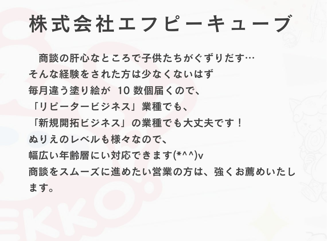 ・企業側から率先してクオリティが高いぬりえを差し出すことによって、子どもが静かにしてくれる様を親御様に見てもらえるので、ご来店された親御様から感謝をされる。