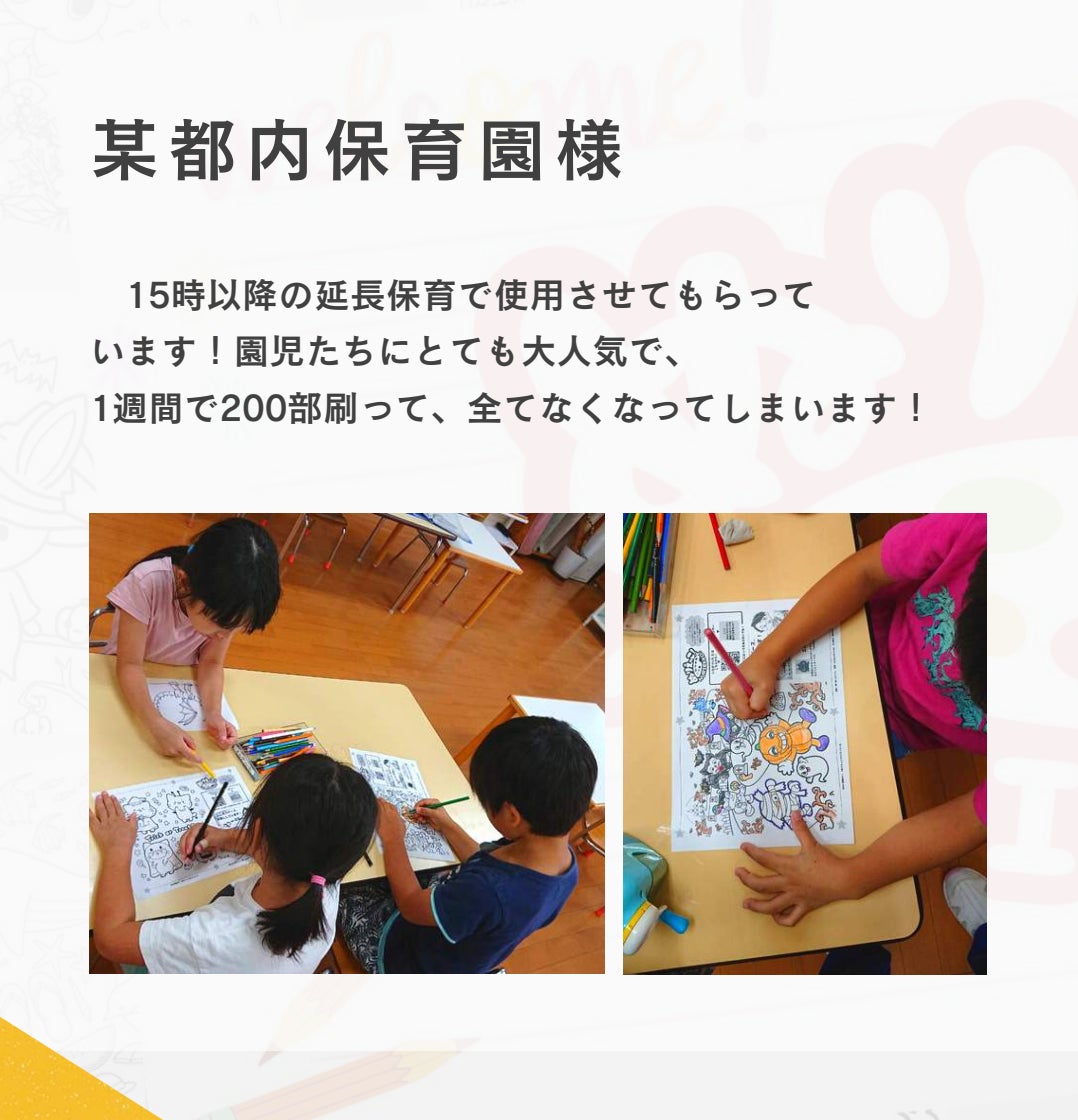 A:無料で配布できる理由として、「広告が入っている為」というご理解を頂けると幸いです。有料にはなってしまいますが、広告を消したうえで、店舗様オリジナルのぬりえの制作も行っております。
