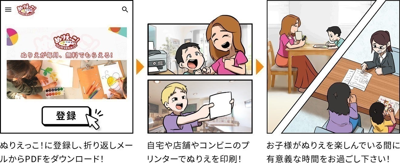 ぬりえっこ!はこちらの公式サイトより登録していただくと、個人・企業問わず誰でも毎月無料で10名のイラストレーターのぬりえをPDFデータで受け取る事ができます。受け取ったぬりえはご自宅や企業やコンビニのプリンターで印刷することで、何度でもぬりえを遊んでいただけます。