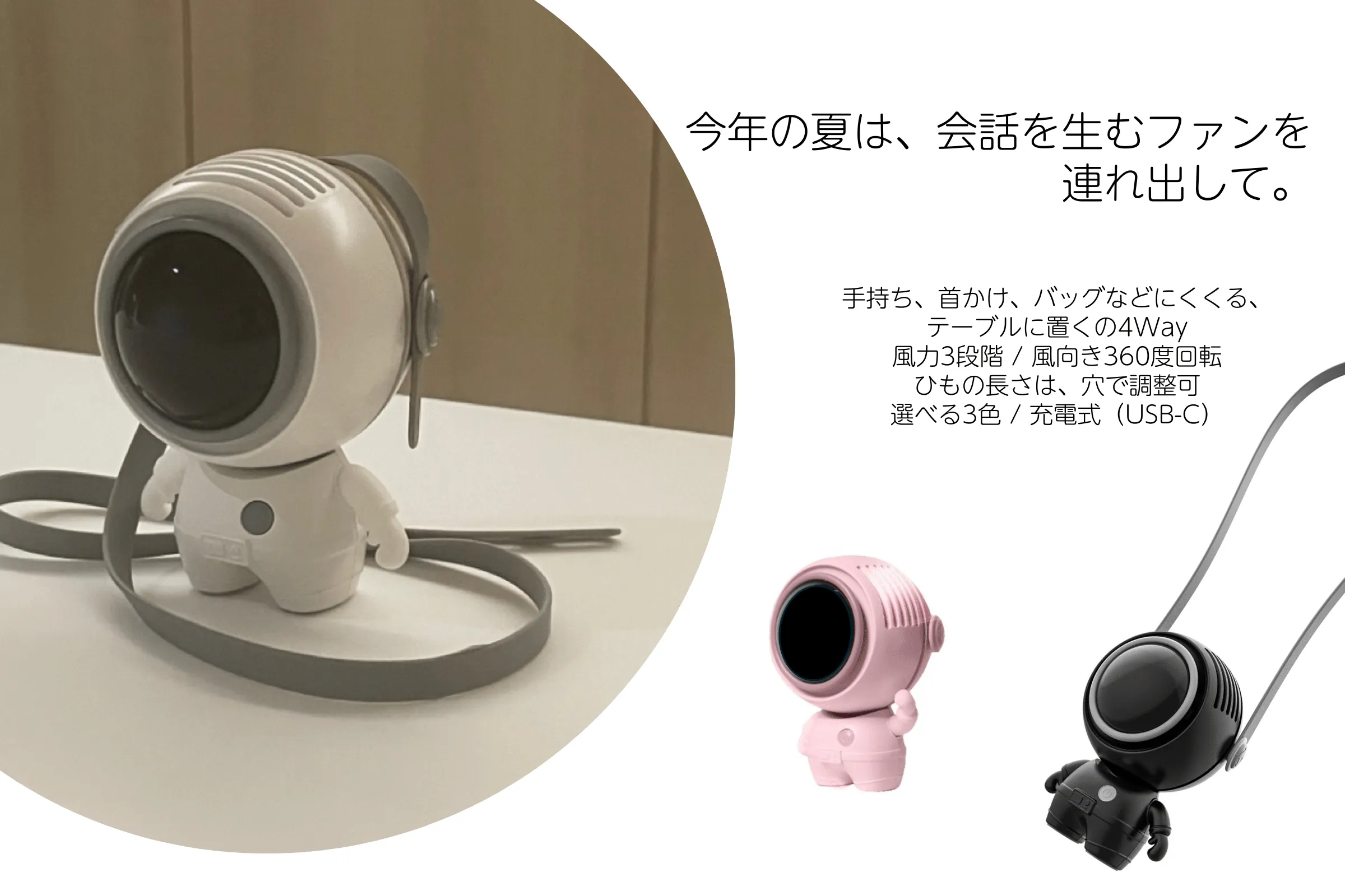 - 1. 宇宙飛行士の形をしたポータブルファン(カラー3種。単品、2個セット、100個セット)