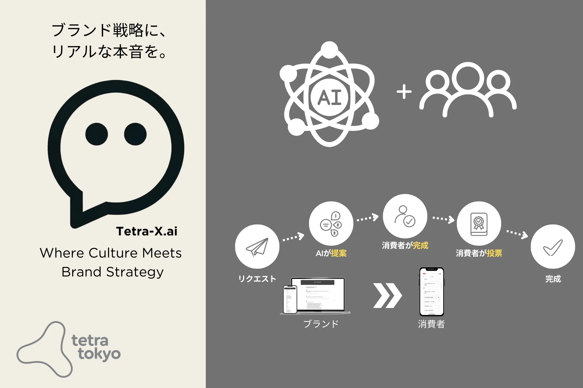 Tetra-X.aiは、Tetra Tokyoが開発した特許申請中のコンテンツ制作ソリューションです。AIコピーライターと消費者が共創し、最適な広告メッセージを効率的に作ります。実際の消費者がコンテンツ開発に加わることで、嫌われることすらある広告メッセージを、リアルでライブなものに変えます。マス消費から多様な価値観に合った消費に移行する時代に、言葉や文化の壁を越えることで、日本とグローバル市場のギャップを最小にします。