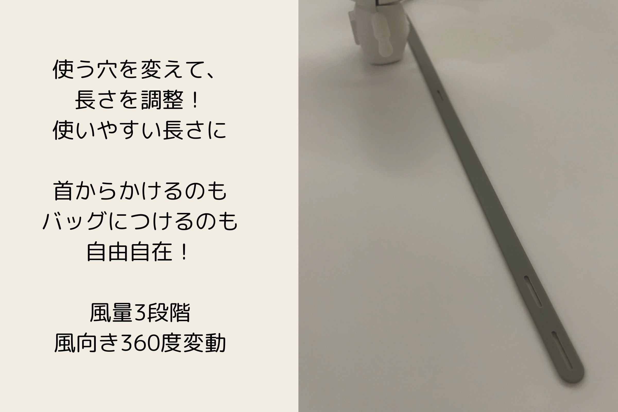 - 手持ち、首かけ、バッグなどにくくる、テーブルに置くの4Way