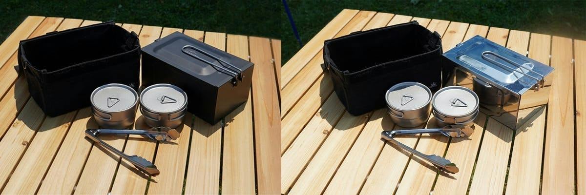3.本体・小型トング・concosメスティンカバー(特別限定カラー)・チタン製 蓋つきスタッキングカップ×2個