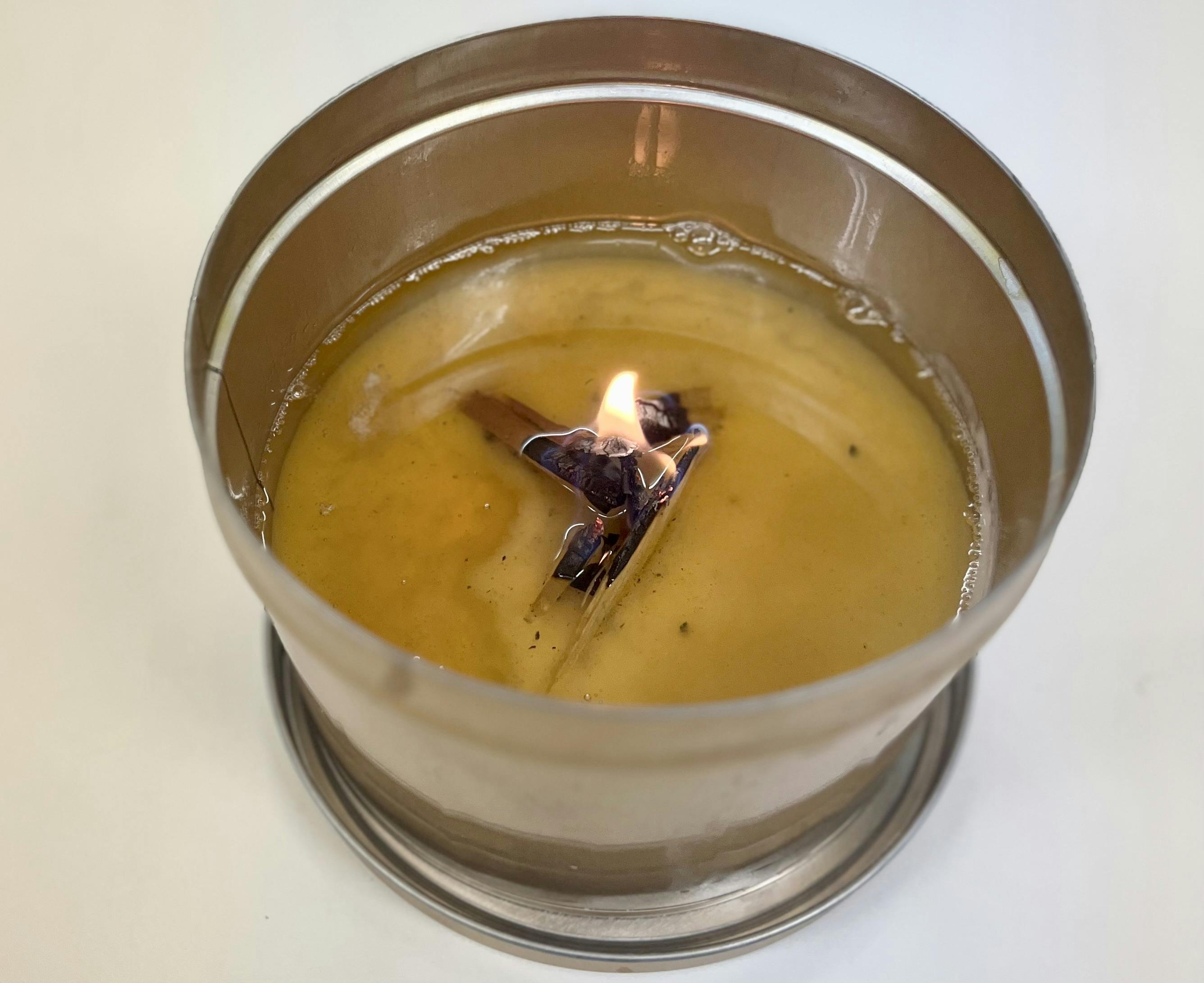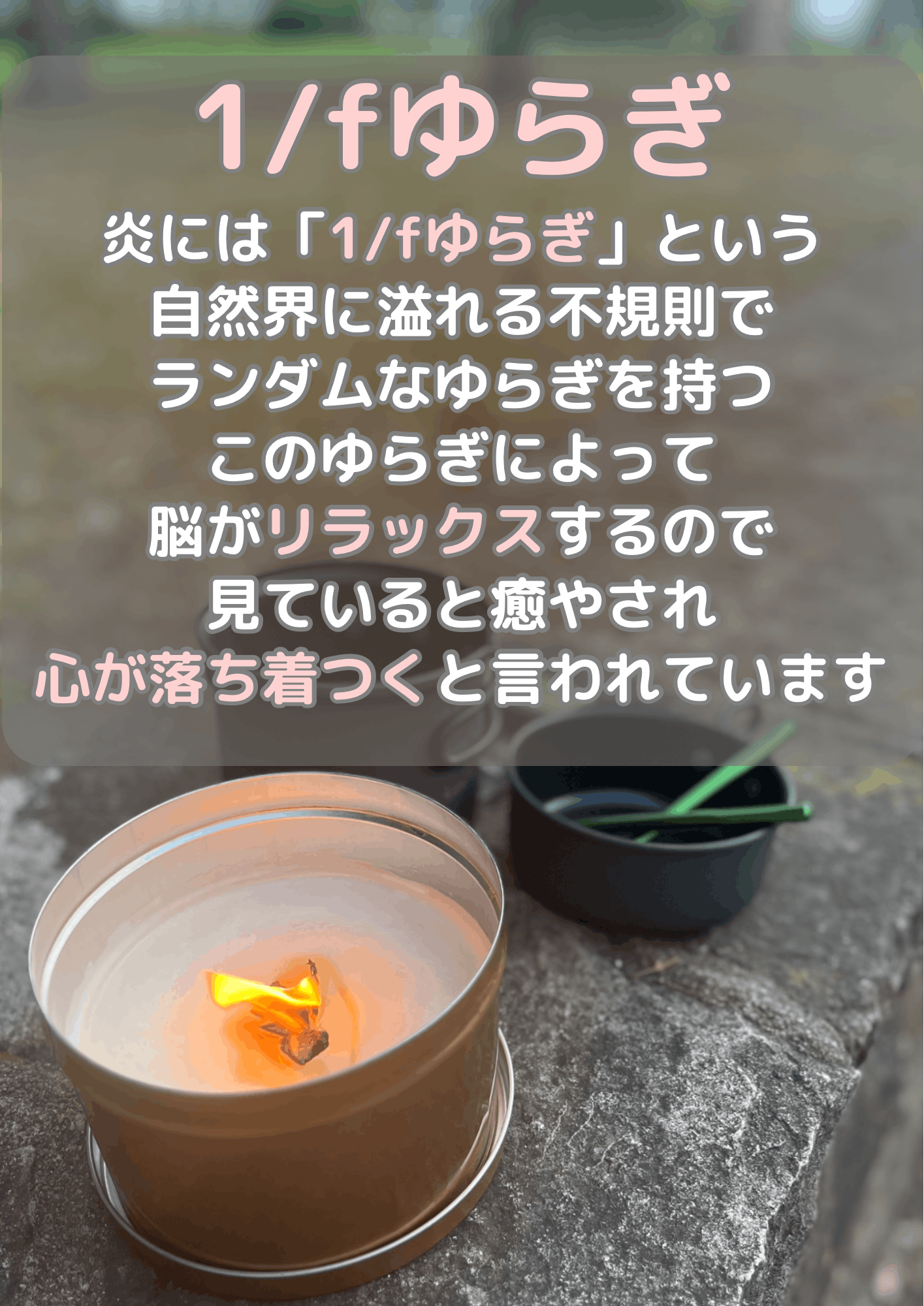 3:炎のゆらめきとアロマの香りをお楽しみください。最低1時間ほど燃焼するのをおすすめします。また、木芯の中心部に固定用の金属が見えましたら(約1㎝残っている状態)使用しないでください。