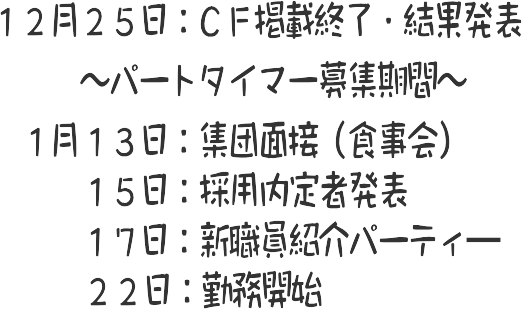 このプロジェクトが達成された場合、パートタイマーさんの募集から勤務開始までの計画を次の通りとさせて頂きます。