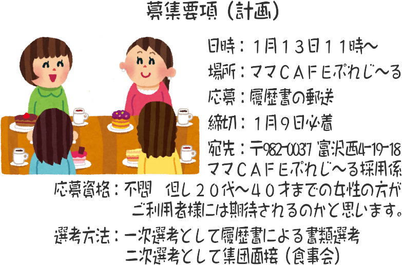 新規に働いてくれるスタッフさんのためにも当面のお手当てが出せるよう資金集めが出来たら、素敵な方を募集できるような手配をする準備はOK。下記の要件で計画しております。