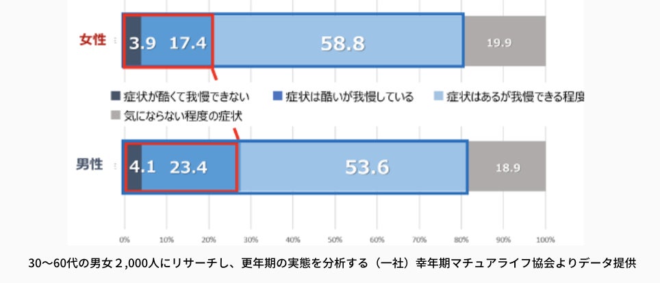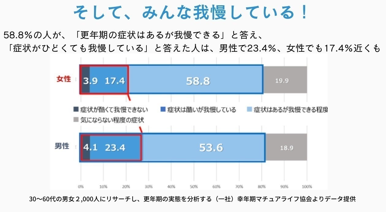 「更年期の症状を周りに伝えた時、そんなの気のせいじゃない?とか、言われることは多いかもしれませんね。そのことで、結局相談や受診ができなくなることも。更年期=おばさん、というような、ネガティブなイメージが蔓延していることも否めません」本プロジェクトに参画する関口真紀先生は話します。だからでしょうか。データでは56.8%の人が、「更年期の症状はあるが我慢できる」と答え、「症状がひどくても我慢している」と答えた人は、男性で23.4%、女性で17.4%もいます。
