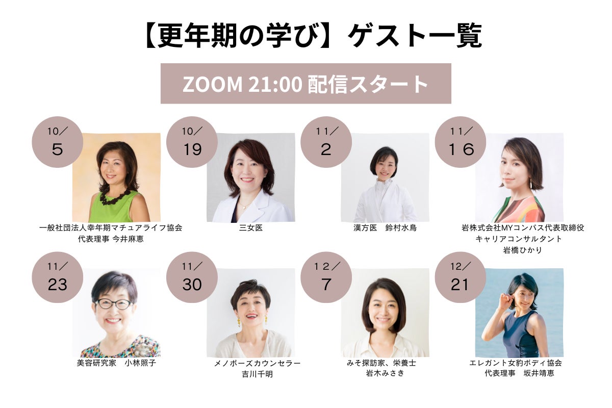 医療的な知見のレクチャーとこころや体に寄り添うワークショップをセットにした、更年期世代のための学びの場。周囲の理解を深めるために、パートナーやお子様と視聴することもおすすめします。オンラインの8回完結のプログラムで、うち1回はスクーリングとして美容研究家の小林照子先生の特別講義と交流会を行います。