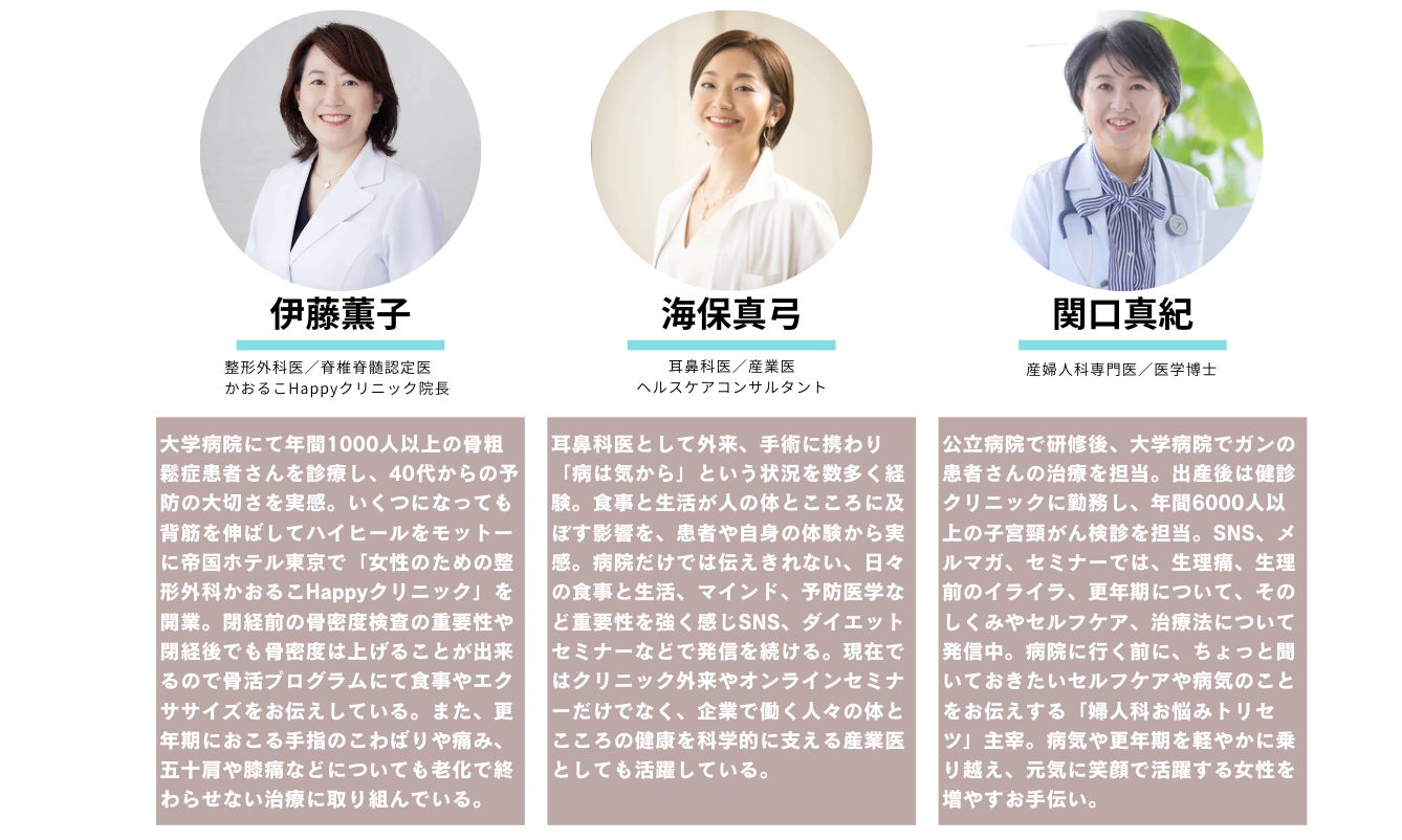 今、私たちに必要なのは更年期の正しい知識と共感できる仲間たち。更年期は正しくケアすれば、楽にやり過ごすことが可能です。そのために、正しい医療情報とセルフケアを体系的に学び、美意識の高いライフスタイルとして実践するための講座を開講します。「医療的知見、専門家の意見を聞きたい」というご要望から、現役の3先生方をファシリテーターに、美容、食、運動の分野のエキスパートを招き、対話&実践形式で進める全8回のオンライン講座です。3名の現役女医さんによる医学的知見と、第一線で活躍する専門家たちの経験から更年期をわかりやすく楽しく、実践的に学べるのが【更年期の学び】です。