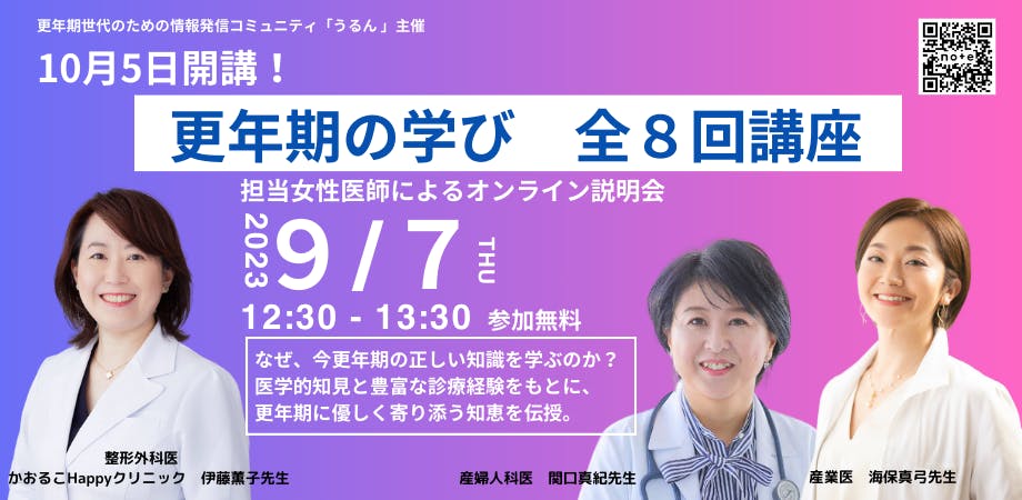 2023/09/15 09:01 ◆9月7日(水)に【更年期の学び】の受講説明会を開催しました。44名の皆さまにご参加いただき、「更年期」に対する関心の高さを伺い知ることができました。ありがとうございます!この日は、ファシリテーターとして講座をリードする関口真紀先生、伊藤薫子先生、海保真弓先生がご登場下さり、『どんなことを学ぶの?』など各回の学びの説明と、ゲストのプロフィールなどを紹介して下さいました、また、参加者者からの質問などにもお答えしました。詳しい内容は、こちらのYouTubeからご覧いただけますので、お申し込みに悩まれている方やもっと内容を知りたいと思われる方は、どうぞご参考下さい。引き続き、皆さまの温かいご支援、拡散のご協力のほど、よろしくお願い致します! もっと見る