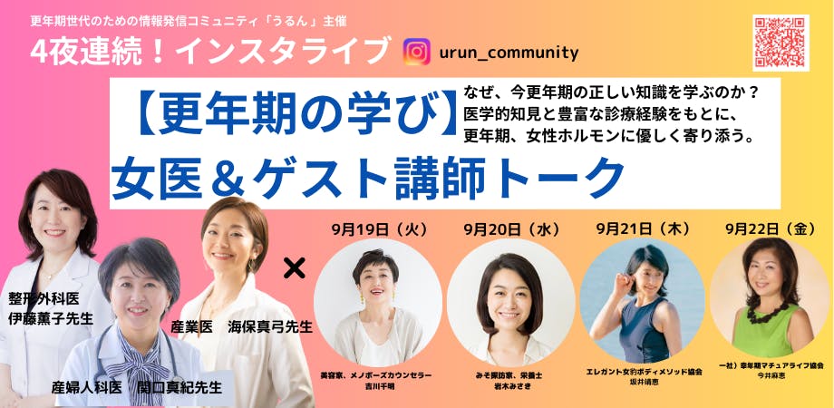 2023/09/17 09:39◆4夜連続、ゲスト講師を招いてインスタライブ を行います。【更年期の学び】どんなことが学べるの?そういったご質問を受けまして、講座にご登壇いただくゲスト講師を招き、3女医の先生進行のもとで、講座にまつわる内容についてあれこれ雑談するトークイベント行います。肩肘貼らない内容です。コメント欄から質問も受け付けます。更年期、女性ホルモンのことなどなど、どうぞお気軽にご参加下さい。日時:ライブスタート21時ゲスト講師9月19日(火) 美容家、メノポーズカウンセラー 吉川千明9月20日(水) みそ探訪家、栄養士 岩木みさき9月21日(木) エレガント女豹ボディメソッド協会 坂井靖恵9月22日(金) 一社)幸年期マチュアライフ協会 今井麻恵↓インスタこちらよりお入り下さい。インスタ@urun_communityhttps://www.instagram.com/urun_community/ もっと見る
