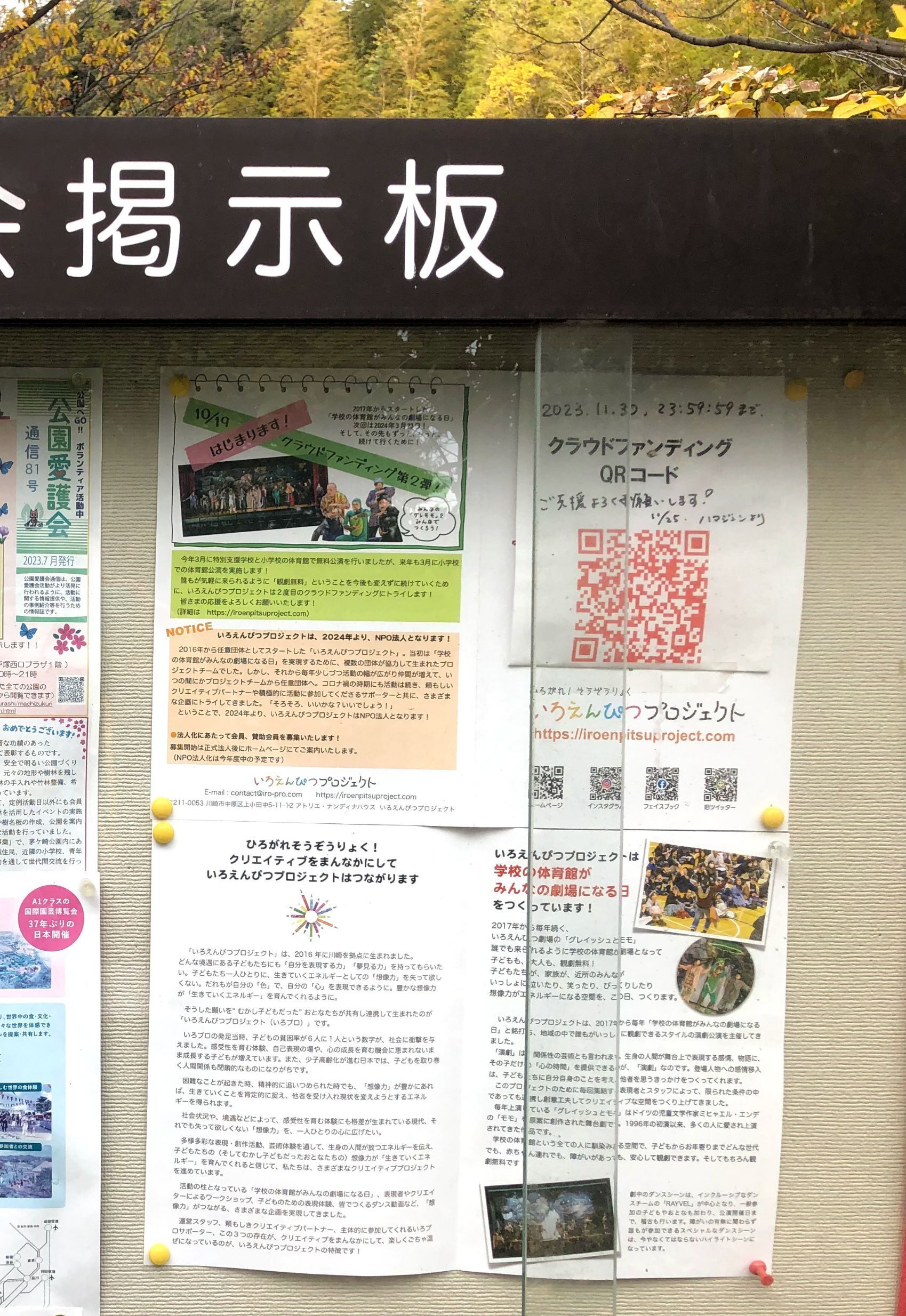 [鯛ヶ崎公園プレイパーク] にも、いろプロのクラウドファンディングページにひとっ飛びの、QRコード&パンフレットを掲示して頂きました‼︎