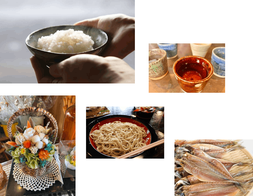 新米コシヒカリ、フラワーギフト、焼き物、地魚の干物の詰め合わせ、三瓶そばほか