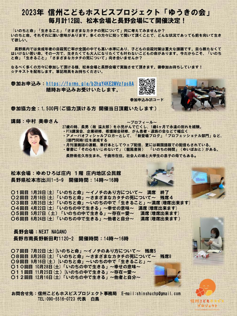 ⑤信州こどもホスピス 語る会「ゆうきの会」(Zoom開催) 国政や県政での小児医療並びにこどもホスピスに関する取り組みについて、多様性を認め合う社会の構築について、こどもホスピス活動団体のネットワーク構築についての各テーマ講演を聞き、参加者で分かち合いました。