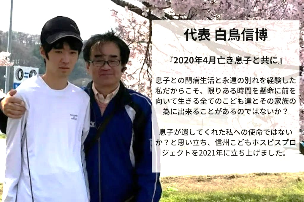 信州こどもホスピスプロジェクト 代表 白鳥信博の長男 佑樹が家族と共に小児ガンと闘った経験、そして、わが子を亡くした経験を通じて、こどものためのホスピス 「こどもホスピス」の必要性を感じ、地元 長野県に信州こどもホスピス施設を設立することを目的として、2021年から活動をを開始しました。