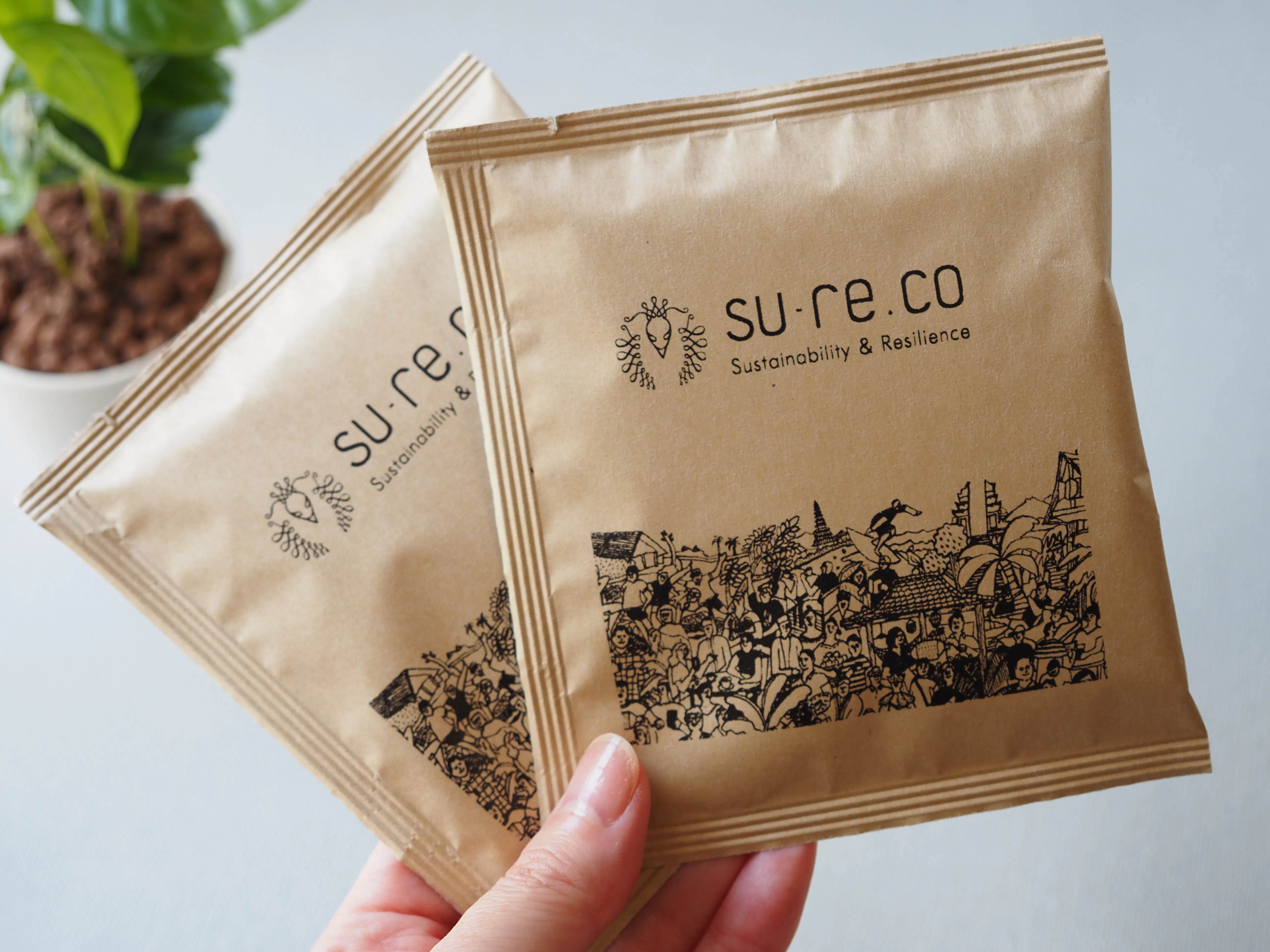 *コーヒーバッグのパッケージデザインは、su-re.coのプロジェクトに関わる人々とバリ島の風景です。
