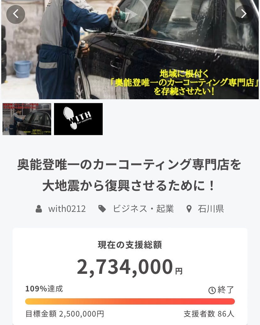 2023/10/01 14:47【クラウドファンディング終了】9月1日から始まり、昨日募集が終了しました。27日に目標達成をし、ネクストステージへ。最終日ネクストステージをクリア!支援者の皆様に心から感謝申し上げます。非常に厳しいプロジェクトを成功させるために…成功したのはいくつかの理由があると思っています。① 支援者の方が他の方へPRしてくれたこと。SNS、直接会話、チラシを用いてご協力いただきました。多くの方が多くの方へ広めていただきました。② 支援の皆様が大きな支援をしてくれたこと86名の支援者様に恵まれて、ネクストステージもクリアしました。③ プロジェクトチーム今回SNSでの周知だけでなく、チラシを6,000枚配布。市内外に手配りで周りました。折り込みではなく、現地に向かい、会った方と直接話すを心掛け1ヶ月の配布を乗り切りました。また、数日に1回プロジェクト会議。策を練り直しては、また実行を繰り返しました。④ 応援のメッセージ自信を持つ事・信じる事・今できる事をするこの気持ちをいつでも崩さない。プロジェクトチームにとってここが1番過酷。色々な方々からのメッセージに支えられ、ここまで来れました。見えない所で、誰かが動いてくれている。知らないところで。達成にいたり、支援者の方、プロジェクトチームの仲間、それを支えてくださる周りの方皆様のご支援、ご協力があったからこそだと思っております。ここからまた新たなスタートとして、頑張っていきますので、引き続きよろしくお願いいたします。本件につきましては心から感謝申し上げます。リターン発送につきましては、暫くお待ちください。WITHコーティング専門店は今後も更なる進化を遂げます! もっと見る