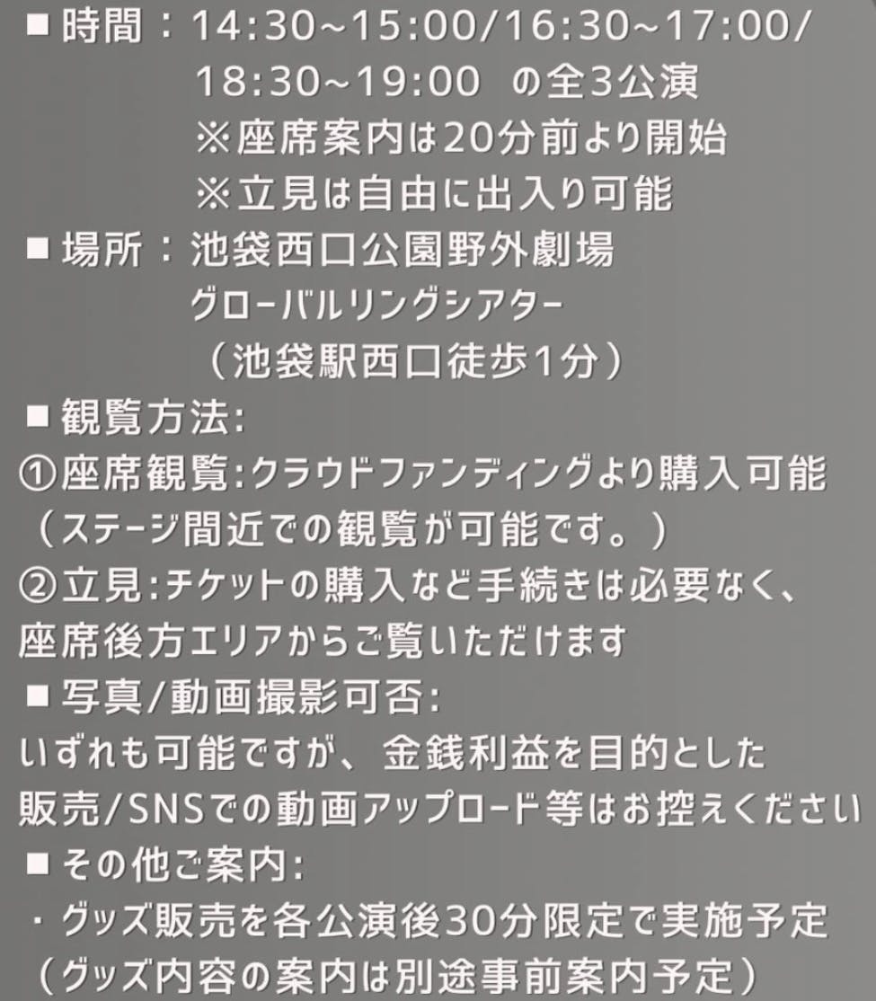 ※本リターンの映像は3回公演の内、より見栄えの良い映像のみに編集しお送りいたします。 - ※リターンとしてお届けする内容について、SNS等での拡散は禁止とさせていただきます。