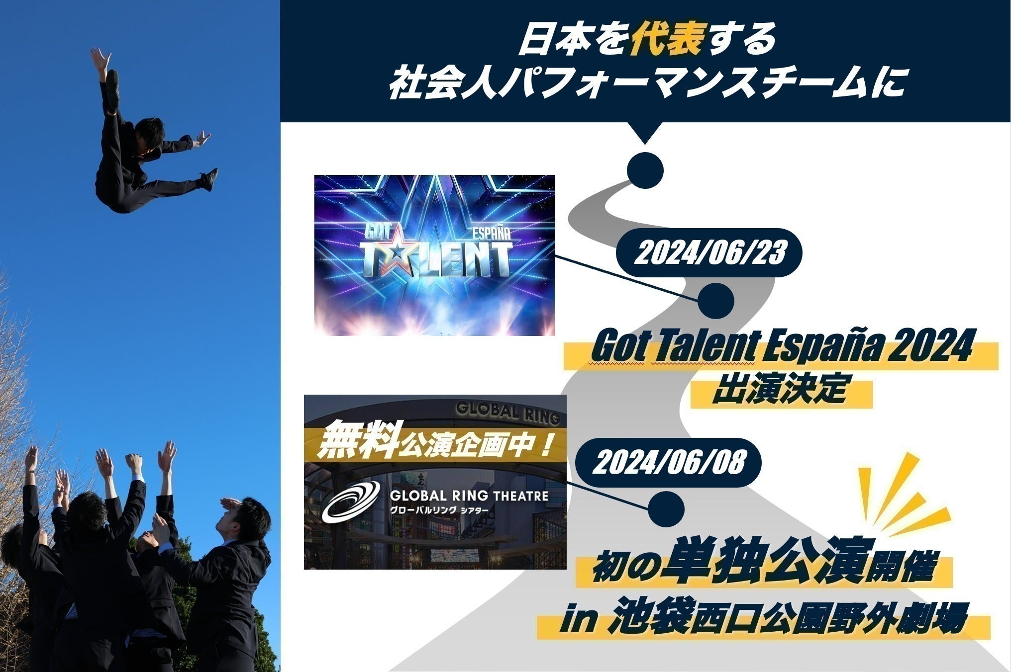 また、今回世界中のパフォーマーの憧れであるゴットタレントへの出場機会をいただきました。この機会を最大限に活用することで、「日本を代表するパフォーマー」と言っていただけるようなチームになってみせますので、何卒、よろしくお願いいたします。