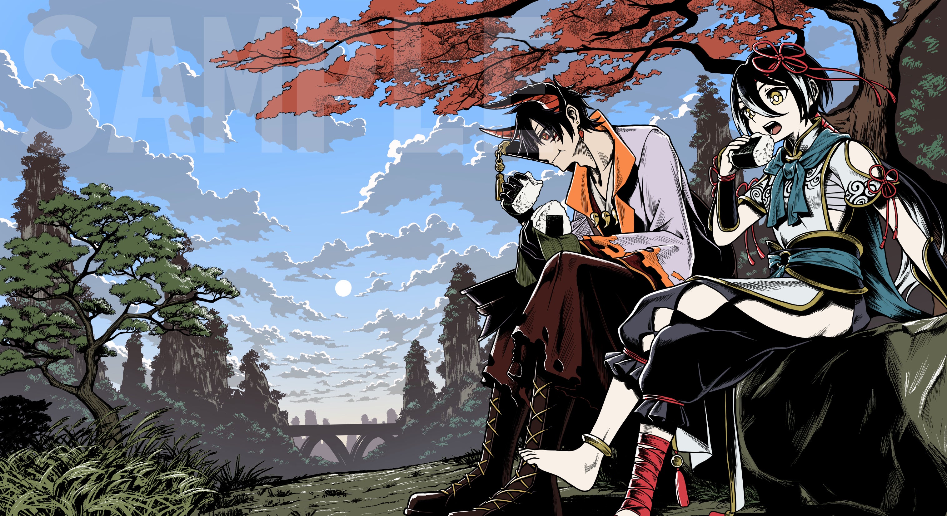 オウマとシンレイが戦場へ赴いている途中の山道で、休憩がてらオウマの持ってきたおにぎりを二人で食べている日常シーンです。