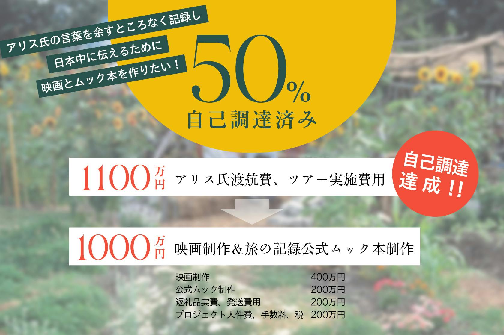 本クラウドファンディングでは、アリス氏の言葉を記録するための映画化、そして、映像では伝えきれないエッセンスをまとめたムック本を制作するのに必要な費用、残り1,000万円 を、皆さまからご支援いただけたらと考えています。