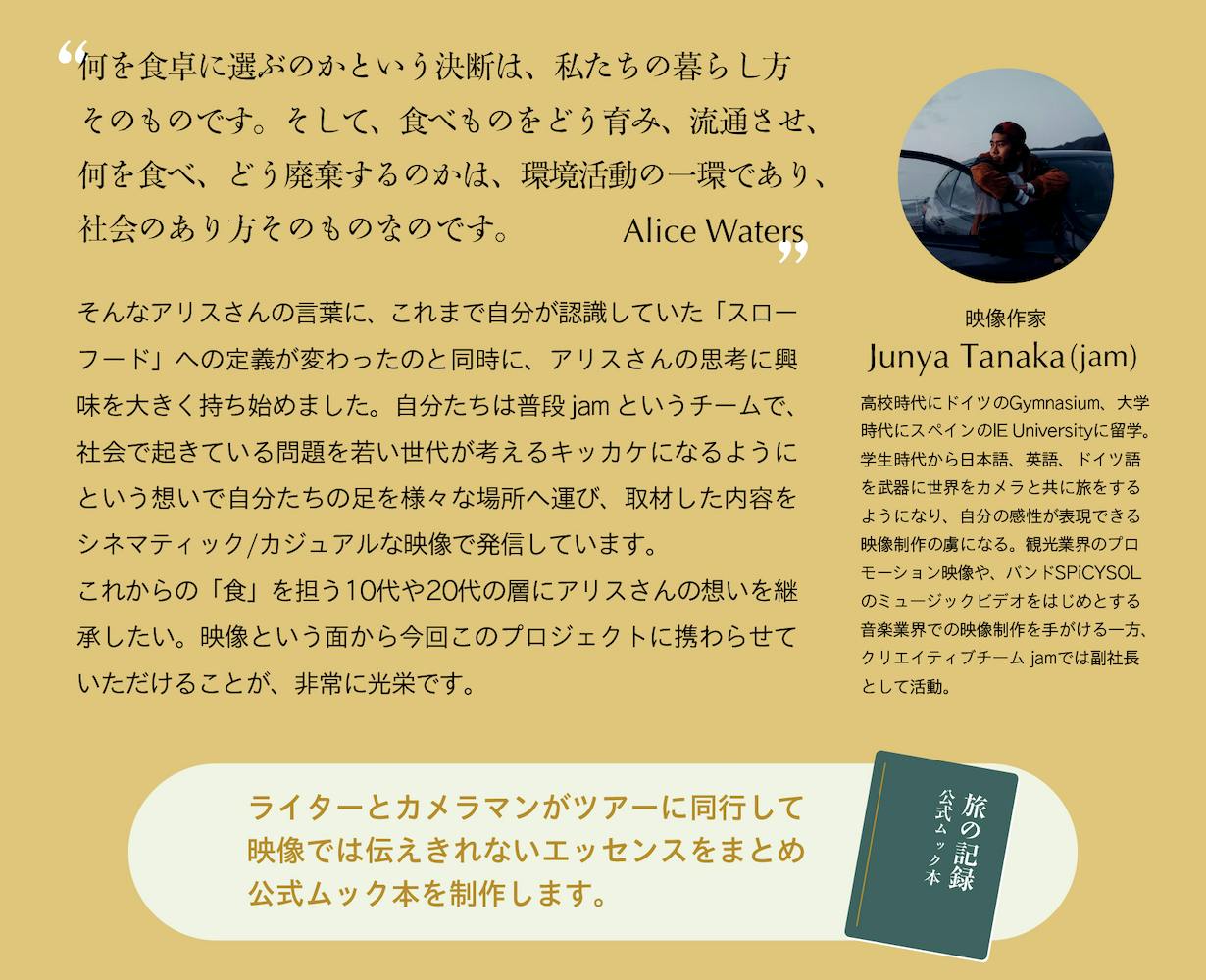 日本にも、人間らしい価値観を取り戻しながら動き出した事例がたくさんあります。その数々を、世界の「スローフード」を牽引してきたアリス氏の視点から読み解く映画にしたい。映画を通して、食べることから "生かしあう経済" が広がる実感を、次世代にまで広げていきたい。そんな夢を形にする資金を、皆さまからご協力いただけたら幸甚です。