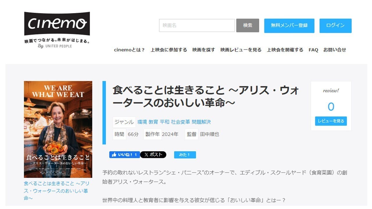2024/05/07 10:47映画配給会社ユナイテッドピープルが運営するcinemoで本映画の取り扱いを開始しました!こんにちは、2月よりクラウドファンディングでご支援いただいた皆様に上映会を開催いただいておりましたが、今後はより多くの方に本映画の上映会を開催いただけるように、ユナイテッドピープルを窓口とした一般の方の上映会の受付を開始しました。また一般配給に伴い、よりわかりやすく周知しやすい映画のタイトルを求めて『食べることは生きること~アリス・ウォータースのおいしい革命~』に改題いたしました。───────────────────────────────────映画『食べることは生きること~アリス・ウォータースのおいしい革命~』https://www.cinemo.info/128m───────────────────────────────────クラウドファンディングで上映権を購入くださった皆様へ今後は新タイトルにて告知案内をしていただけますと幸いです。以下リンクが告知素材となりますので、ご利用ください。すでに開催日が決まっており、旧タイトルにて告知をしているところは、ポスター画像含めて旧タイトルのままで問題ありません。プレス資料:http://cinemo.info/data/WAWWE/press.pdfポスター画像:http://cinemo.info/data/WAWWE/poster.jpg場面写真は下記よりダウンロードください。http://cinemo.info/data/WAWWE/photos.zipクレジット表記をお願いします。©2024 アリス映像プロジェクト/Ama No Kaze予告編:───────────────────────────────────映画を観た方々から、ご自身の地域でも開催したいという声を多くいただいてます。もし周りに上映会を希望される方がおられましたら、ユナイテッドピープルの窓口をご案内ください。→https://www.cinemo.info/128m引き続きクラウドファンディングでご支援くださった方々が主催する上映会も行っています。→各地の上映会情報はこちら もっと見るアリス来日ドキュメンタリー映画に寄せられた声のご紹介