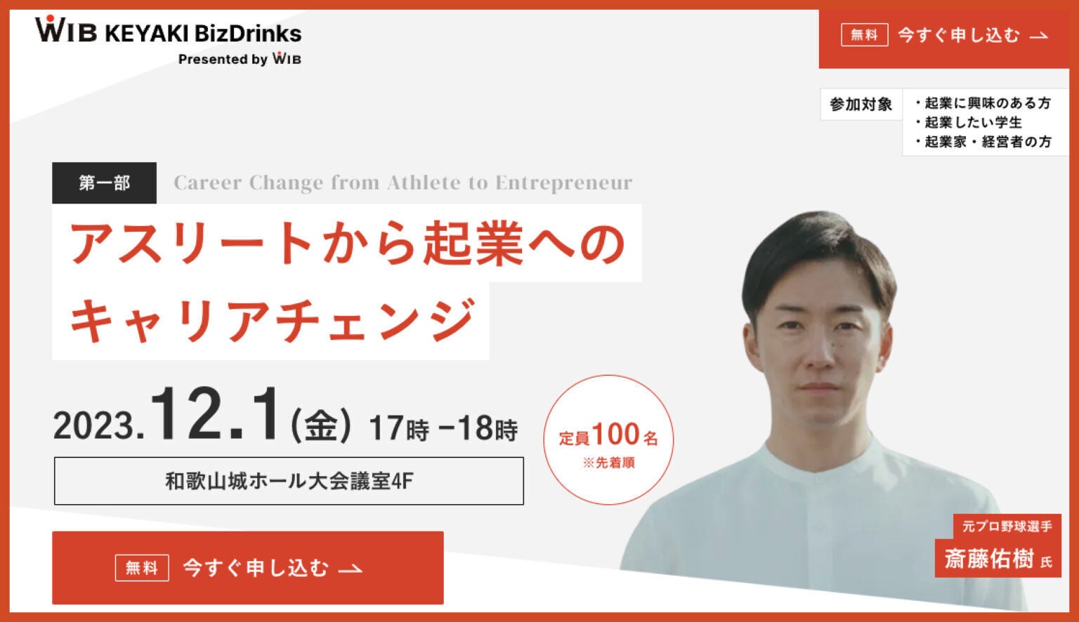 第一部は斎藤佑樹氏の「アスリートから起業へのキャリアチェンジ」をテーマにした講演。第二部はけやき大通り沿いの3店舗の飲食店で、お酒や食事を楽しみながらカジュアルに経営者や起業家の講演が聞け、交流できるイベントです。